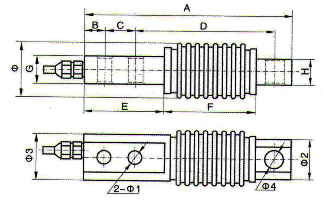 型号 | 量程(kN) | 量程(kg) | A | B | C | D | E | F | G | H | ɸ | ɸ1 | ɸ2 | ɸ3 | ɸ4 |